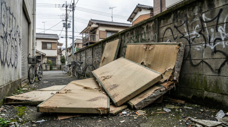 また、分別せずに切ったり分解した畳を家庭ごみとして出すと、収集車での圧縮時に発火・事故が起きる恐れもあります。特に古い畳には金属製のくぎや紙くず、時には乾電池が挟まれていることもあり、非常に危険です。