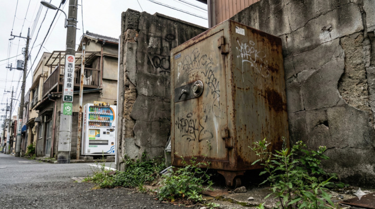 - 金庫が道路にはみ出して放置され、通行トラブルの原因に