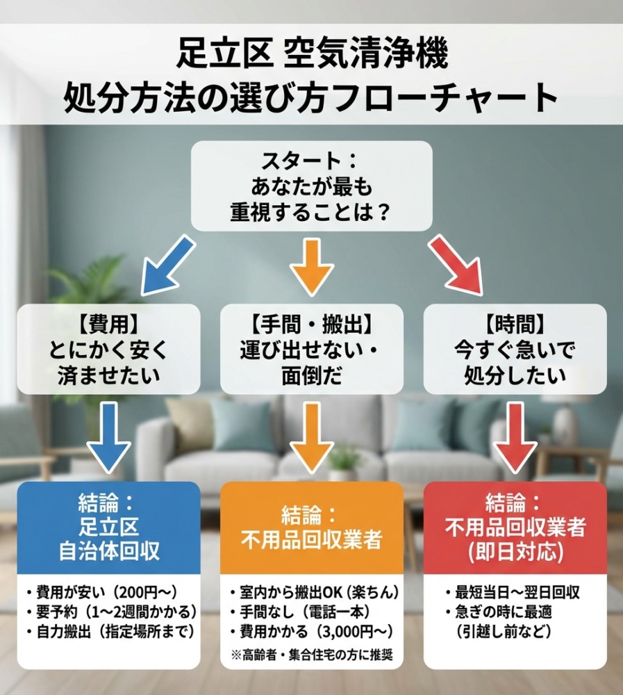 足立区で空気清浄機を処分する場合、費用・時間・手間のバランスを考えて、自分に合った方法を選ぶのが最適です。
