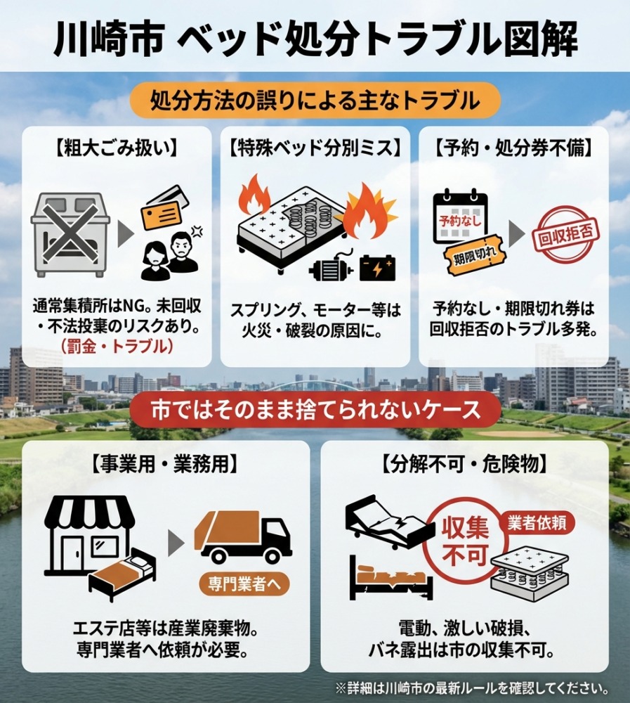 こういったリスクを避けるには、川崎市のルールに沿って正しい手順でベッド処分を進める必要があります。