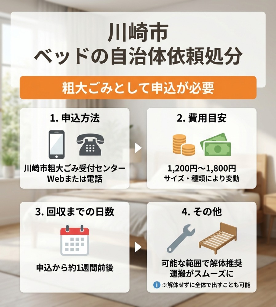 川崎市では、ベッドのフレームやマットレスは粗大ごみとして処分可能です。申し込みは「川崎市粗大ごみ受付センター」からできます。インターネットまたは電話で予約し、収集日に指定の場所に出します。