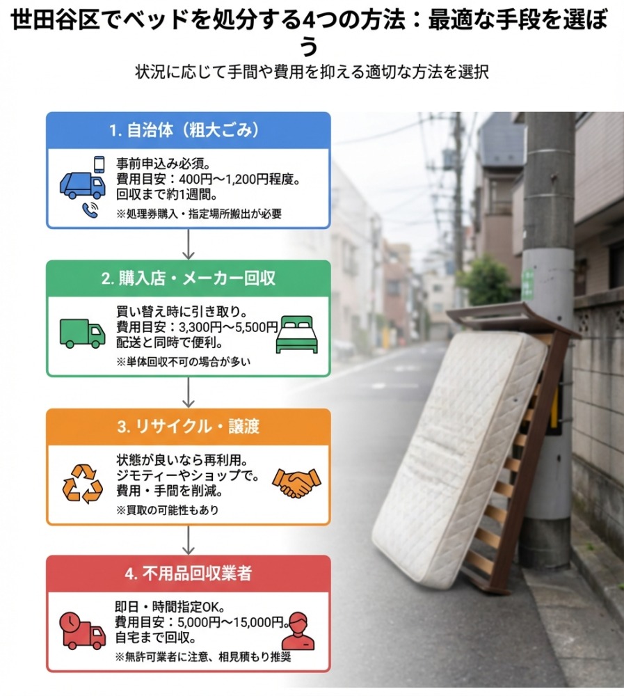 上の画像では、世田谷区内でベッドを処分する際に利用されやすい4つの選択肢が視覚的に整理されています。自治体回収から民間の不用品回収業者まで幅広く、利用者のニーズやコスト、処分までにかかる時間に応じて使い分けることができます。