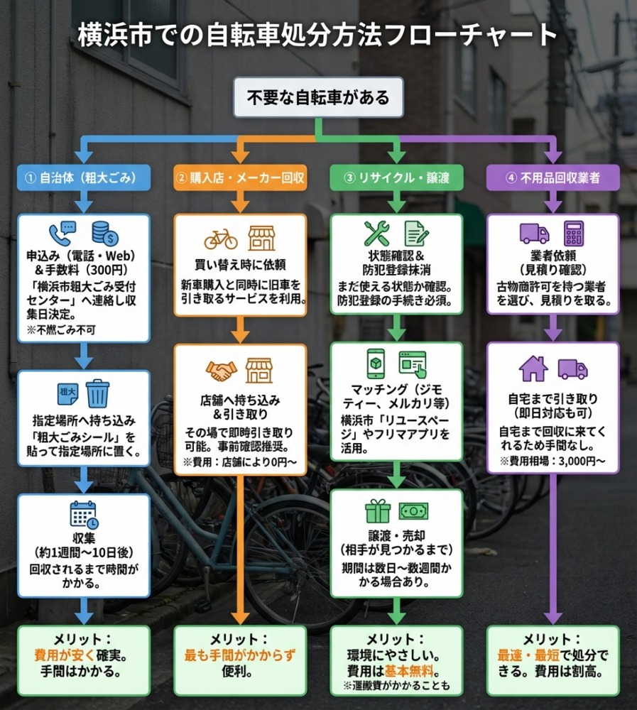 画像からもわかるように、横浜市では多様な自転車処分方法が用意されています。自治体の回収は安価で確実ですが、少し時間がかかります。一方、即日対応の業者や譲渡など、状況や希望に合わせて選べる選択肢があるのが魅力です。