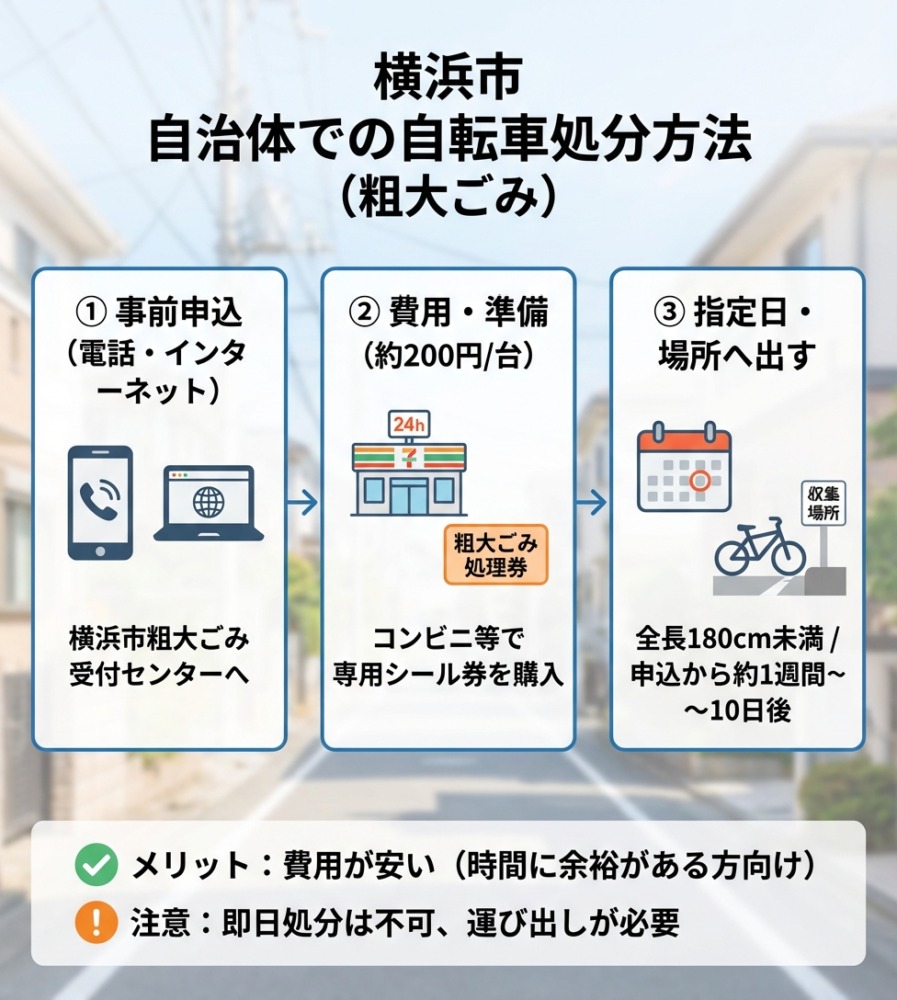 横浜市で不要になった自転車を自治体に処分してもらう場合、基本的には「粗大ごみ」として申し込み、収集してもらうか、自分で持ち込む方法があります。