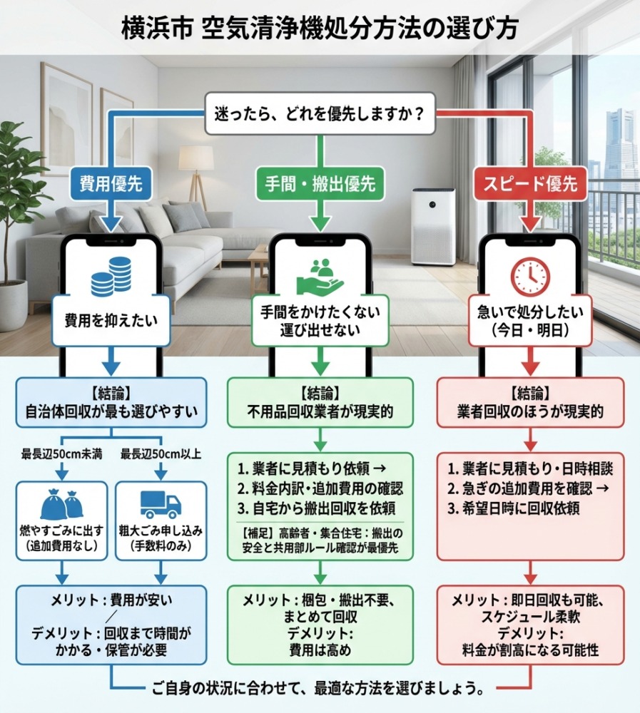 費用を抑えたいなら自治体、手間をかけたくない・大量に処分したいなら業者を選ぶとよいでしょう。