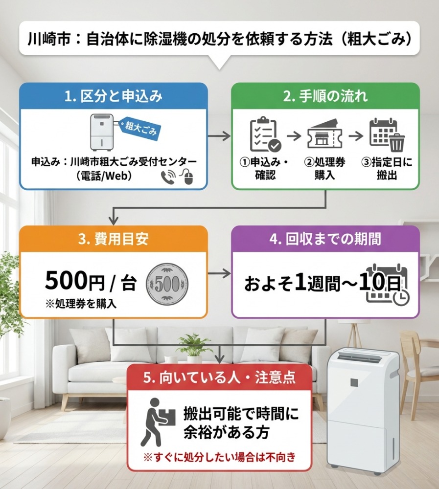 - 申し込み先:川崎市の粗大ごみ受付センター(電話・インターネットで予約)
