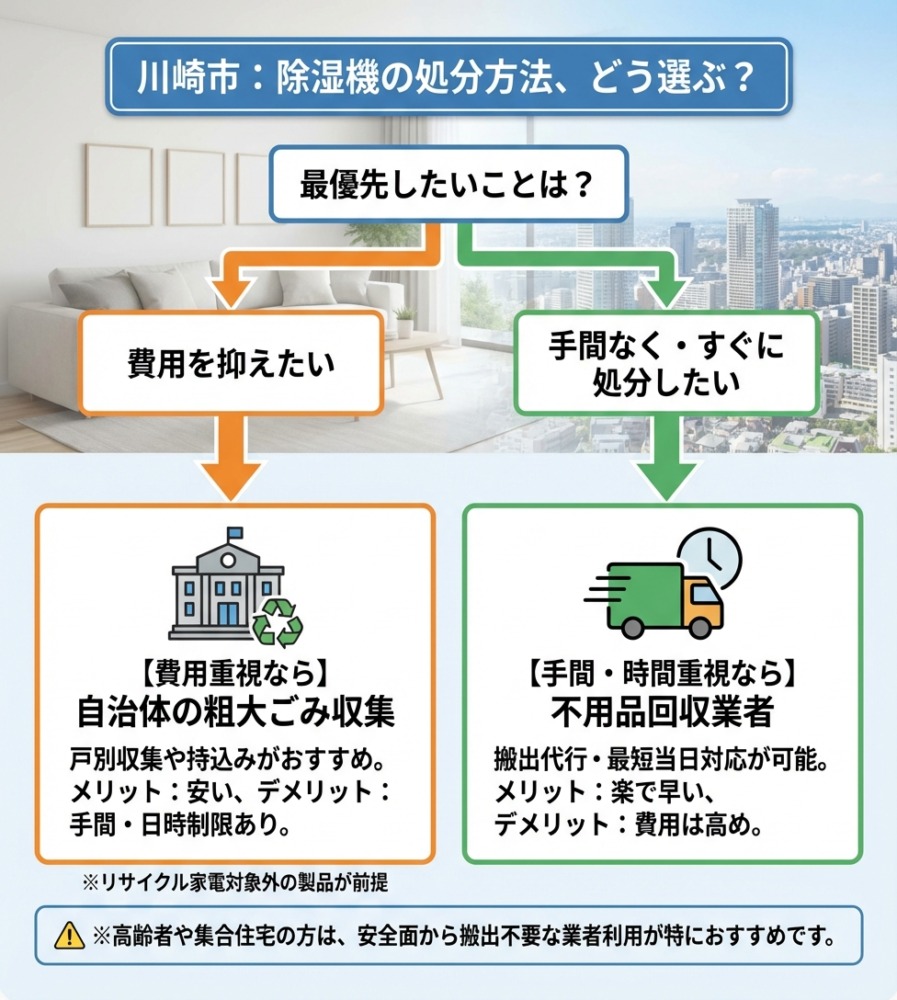 できるだけ費用をかけずに除湿機を処分したい場合は、川崎市が提供する自治体の粗大ごみ戸別収集や持ち込み処分がおすすめです。
