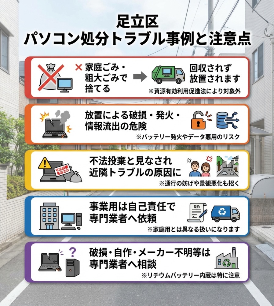 その他にも「運び出し中に破損し、住居や共用部に傷をつけてしまった」「勝手に捨てたと思われ、所有権トラブルが起こった」などの事例も報告されています。専門業者に依頼するか、足立区のルールをしっかり確認したうえでの対応が重要です。