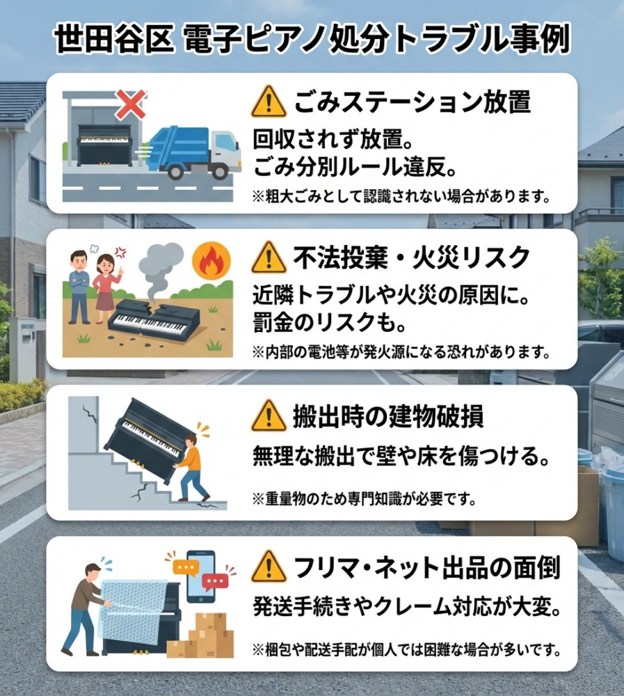 また、無許可での野外放置や不適切な処理は、世田谷区のごみ分別ルール違反となり、近隣住民とのトラブルや火災などの事故につながるリスクも考えられます。電子ピアノは内部に電気部品や金属部材が含まれており、発火の原因になることもあります。