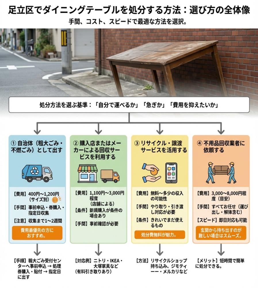 足立区でダイニングテーブルを処分する主な方法は以下の4つです。