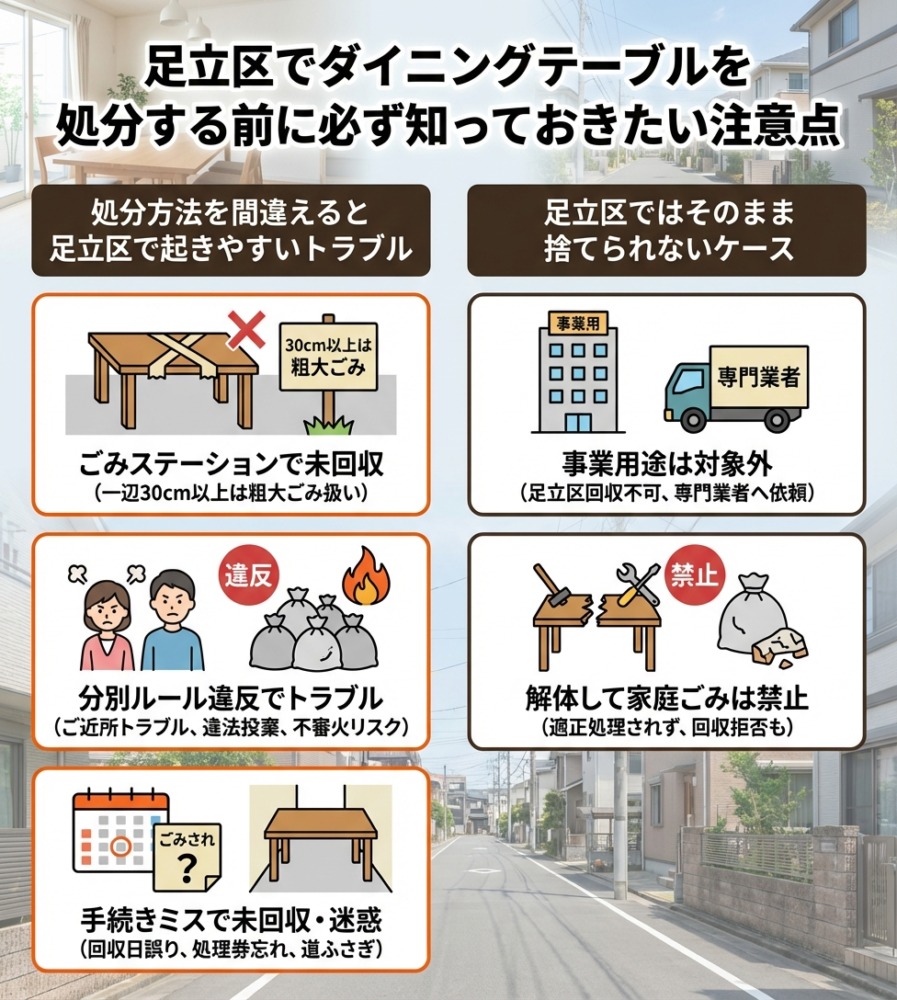 ダイニングテーブルを処分する際、ごみステーションにそのまま出しても回収されないケースが多く見られます。足立区では、一辺が30cm以上あるものは粗大ごみ扱いとなり、通常の収集では持ち去られません。