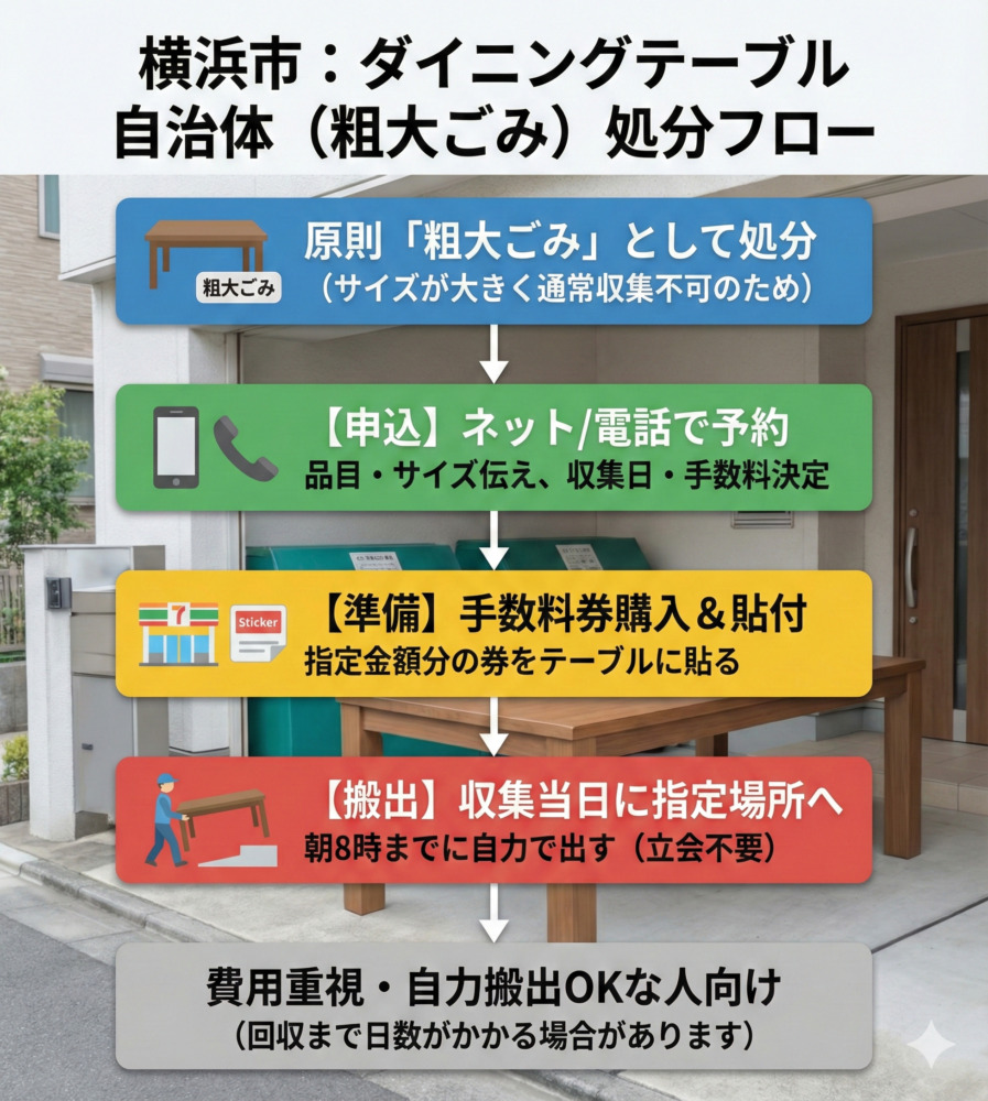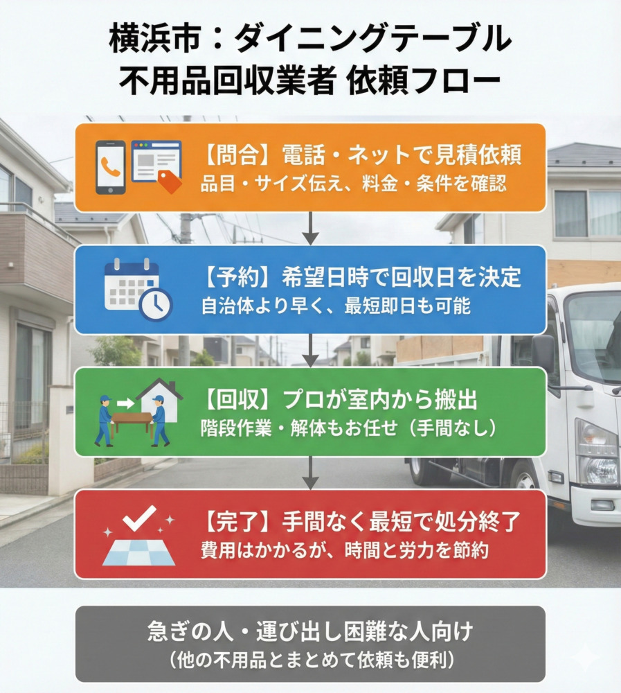 上のイメージは、横浜市でダイニングテーブルを処分する際の代表的な流れを示しています。