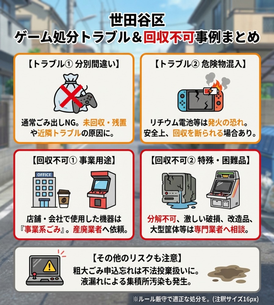また、世田谷区では家庭ごみとして処分できないゲーム周辺機器(バッテリー内蔵型、液晶画面付きなど)もあるため、こうした特殊な回収品にも対応しているかどうかもチェックポイントです。