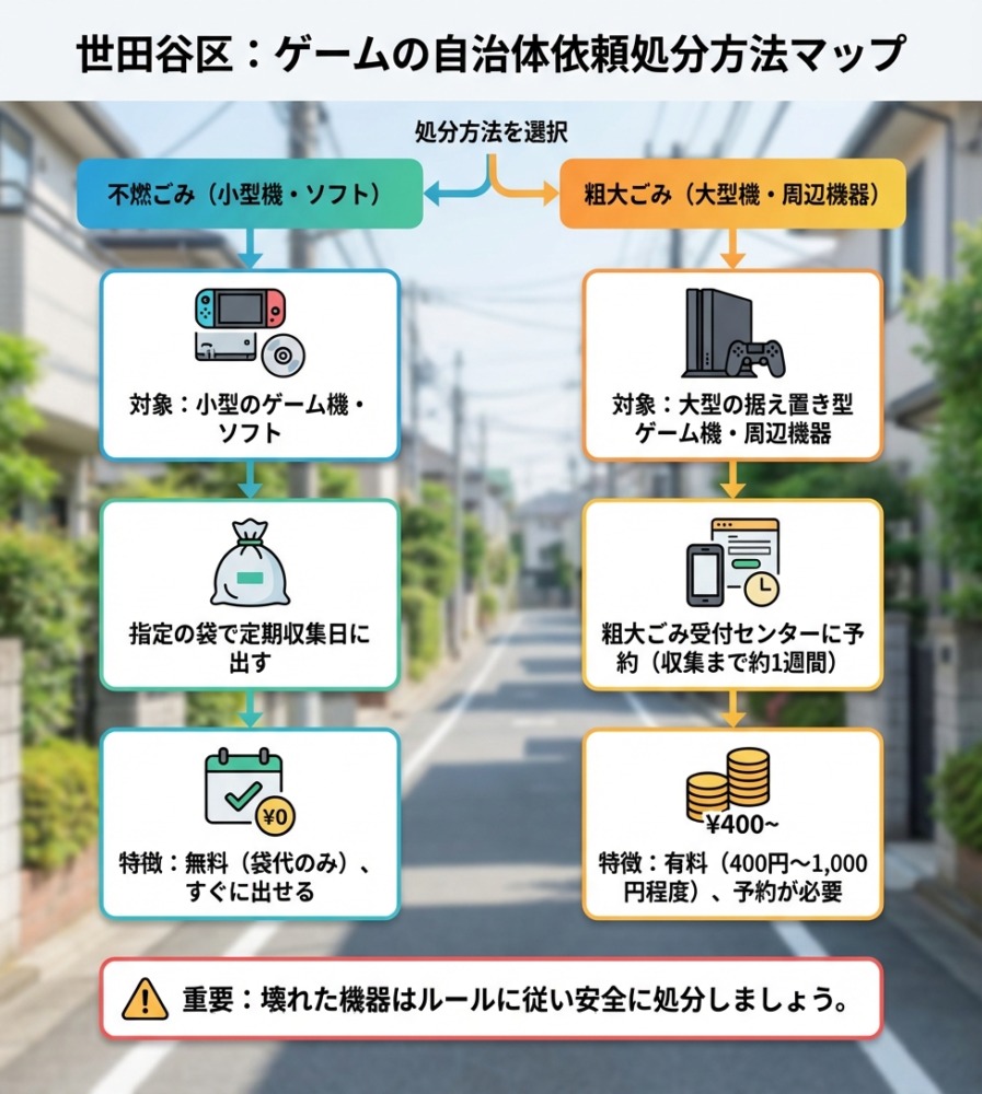 世田谷区では、ゲーム機やゲームソフトの種類によって処分方法が異なります。以下のように分けて考える必要があります: