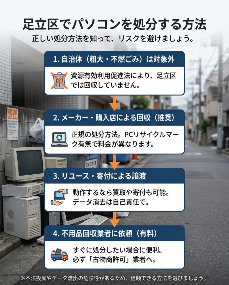 ① 自治体(足立区)のごみ処分制度を使う方法:基本的に教科書は「資源ごみ(雑がみ)」として回収されます。週に1回の資源ごみの日に、ひもで十字にしばって出せば無料で処分できます。破れていたり、水に濡れてリサイクルできない状態なら「可燃ごみ」としてゴミ袋に入れて出しましょう。粗大ごみでは扱われませんので注意してください。