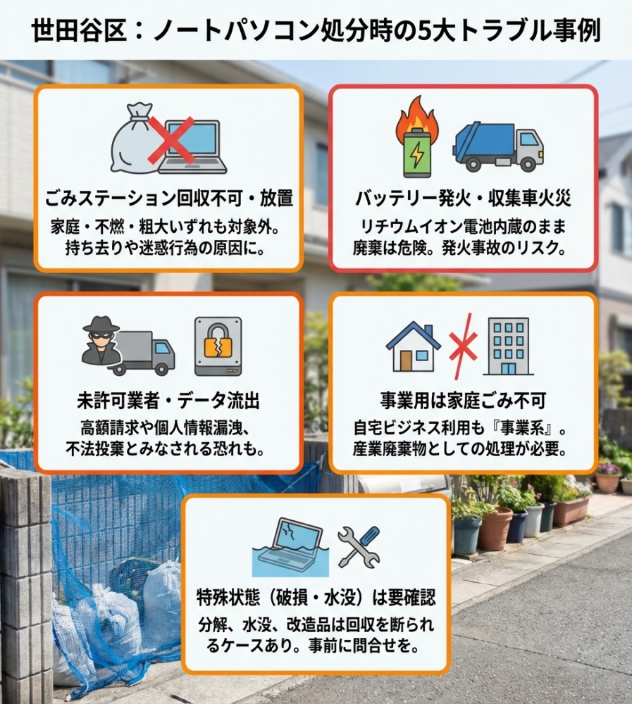 ごみステーションにノートパソコンを出しても回収されません。世田谷区では、ノートパソコンは家庭ごみ・不燃ごみ・粗大ごみのいずれにも該当しないため、ごみ集積所に出しても持ち去りや放置の対象となり、結果として迷惑行為になってしまいます。