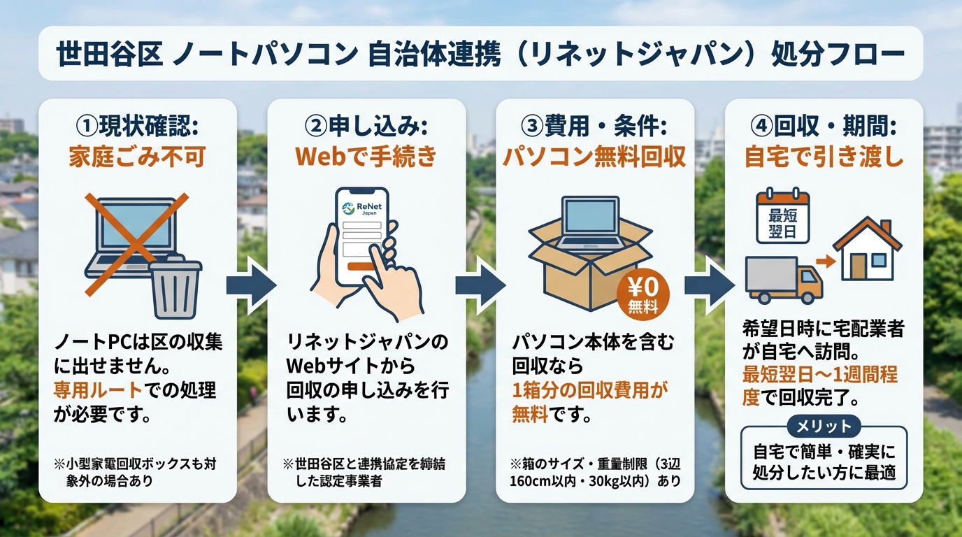 世田谷区の公式サイトでも明記されているように、家庭用のノートパソコンは自治体の収集対象外です。そのため、以下いずれかの方法で適切に処分する必要があります。