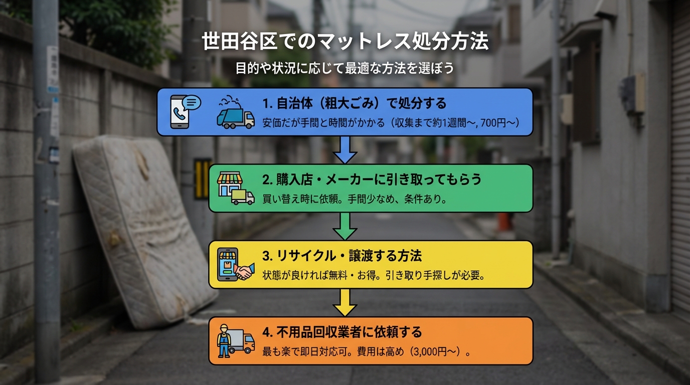 世田谷区でマットレスを処分するには、主に4つの方法があり、それぞれに手順や費用、かかる時間が異なります。目的や状況に応じて最適な方法を選ぶことが大切です。