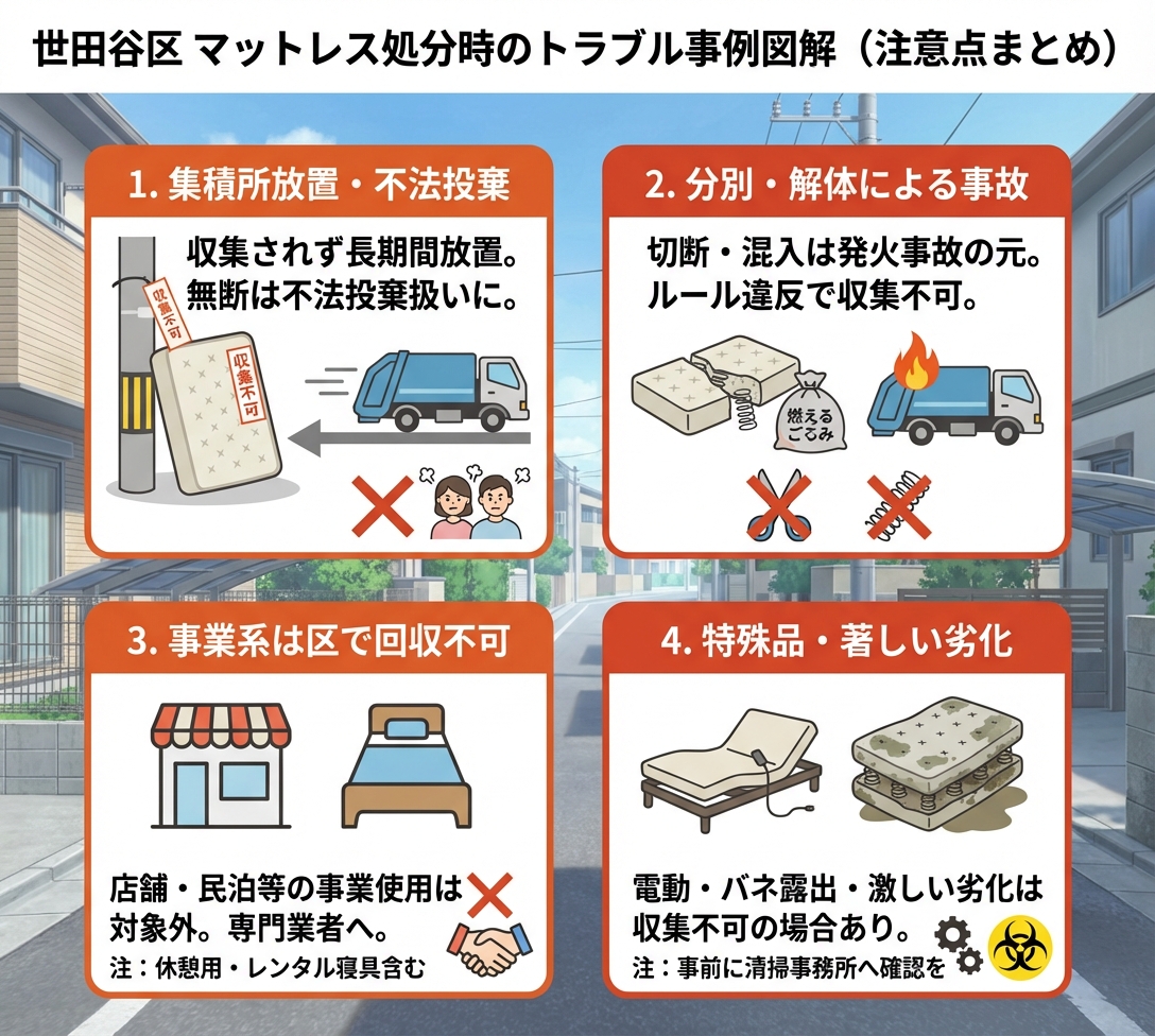 世田谷区では、粗大ごみとしての事前申込みが必須であり、無断で出された大型マットレスは「不法投棄」とみなされることもあります。
