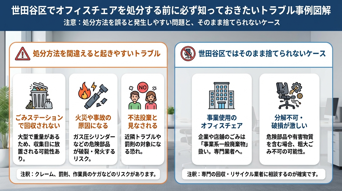 ごみステーションにオフィスチェアを出しても回収されないというトラブルは、世田谷区では特に多く報告されています。大型で重量があるため、自治体の通常の回収対象ではなく、収集日でも放置され回収されないことがあります。
