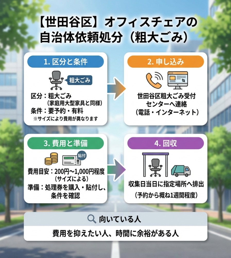 世田谷区では、オフィスチェアは基本的に「粗大ごみ」として扱われます。家庭から排出される大型家具と同様の分類で、要予約・有料で回収が行われます。以下に、処分時に知っておきたいポイントを整理しました。