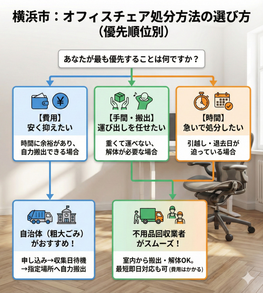 横浜市でオフィスチェアを処分する主な方法は、大きく分けて4つあります。