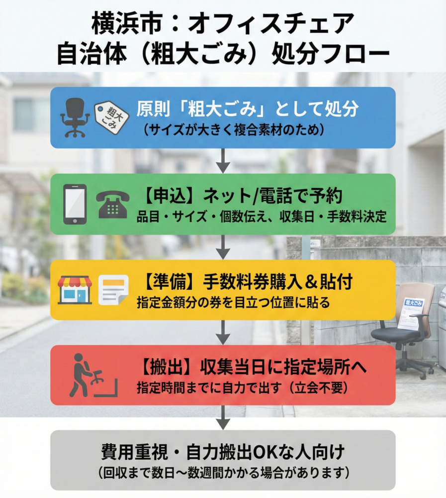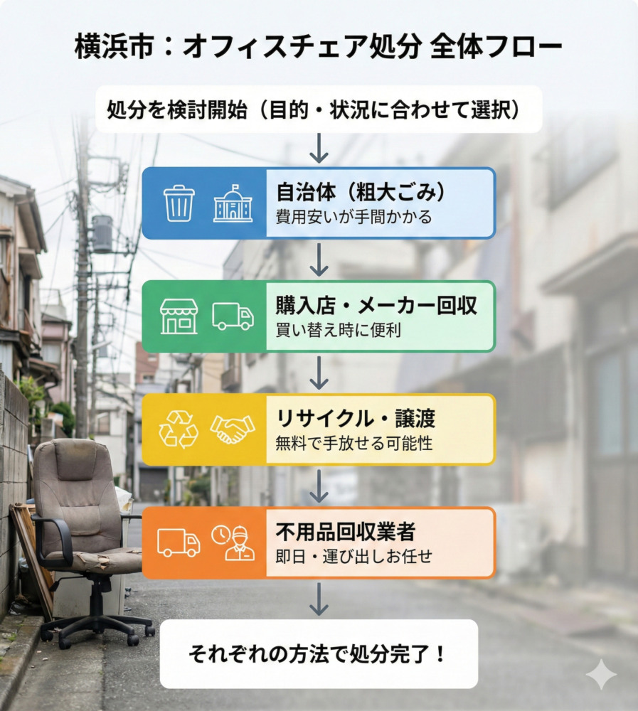 上のイメージは、横浜市でオフィスチェアを処分する際の代表的な流れを示しています。