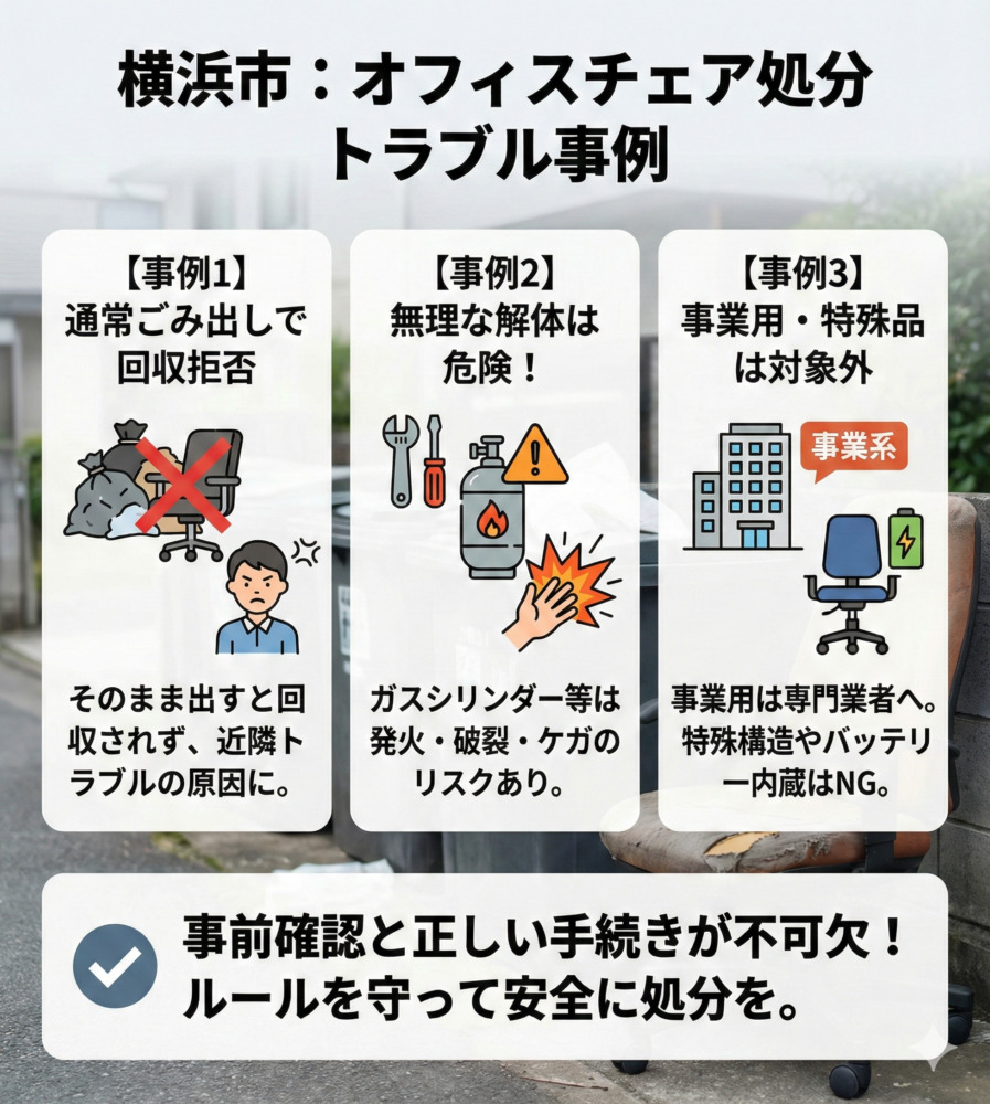 オフィスチェアは見た目以上に構造が複雑で、処分方法を間違えると回収されない・トラブルになることがあります。