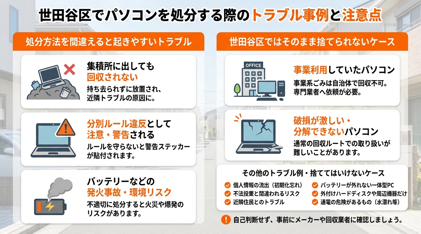 世田谷区でパソコンをごみとして出してしまうと、さまざまなトラブルが発生する可能性があります。以下では、特に注意すべきトラブルについて解説します。