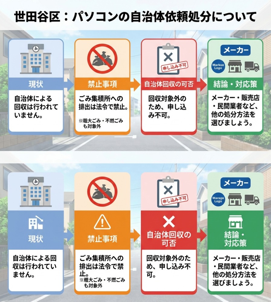 世田谷区では自治体がパソコン回収を行っていません。したがって、メーカー・販売店・民間回収業者などの他の処分方法を選ぶ必要があります。