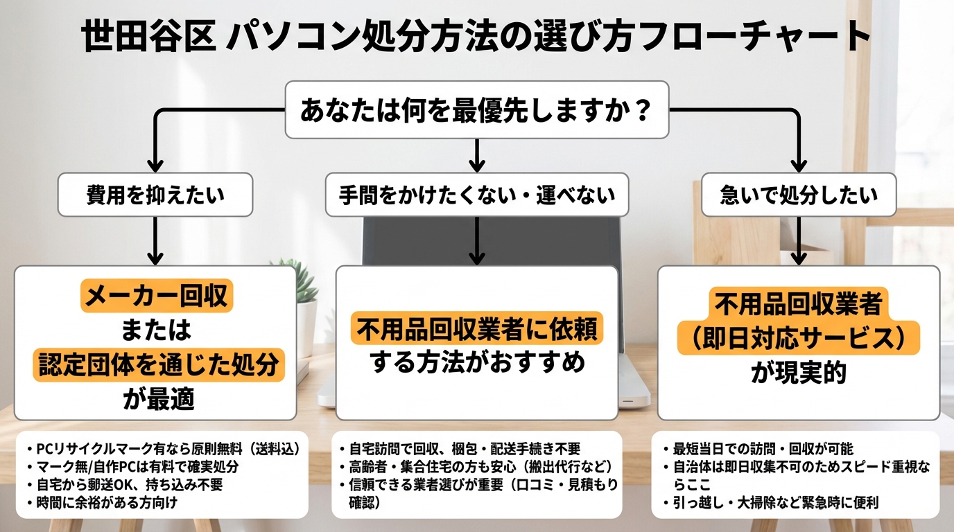 世田谷区でパソコンを処分する際は、「安さ」「手軽さ」「スピード」など、自分の状況とニーズに合った方法を選ぶことが大切です。以下に代表的なケースと最適な方法を整理しました。