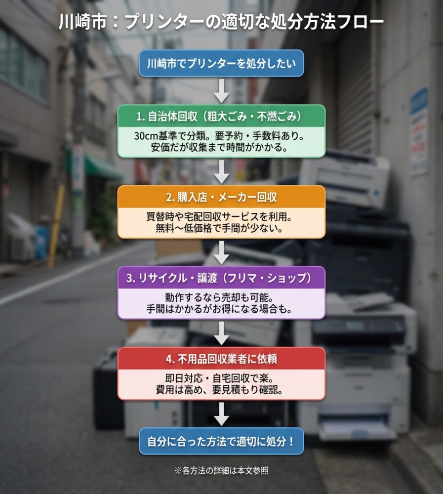 川崎市でプリンターを自治体のルールに従って処分する場合は、以下の表に示す選択肢があります。