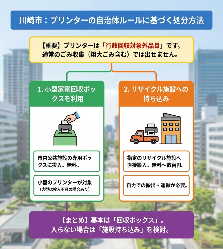 川崎市では、プリンターは通常のごみとして処理できない「行政回収対象外品目」に指定されています。このため、自治体の通常のごみ収集では処分できません。また、家電リサイクル法の対象でもないため、独自の処理ルートが必要になります。