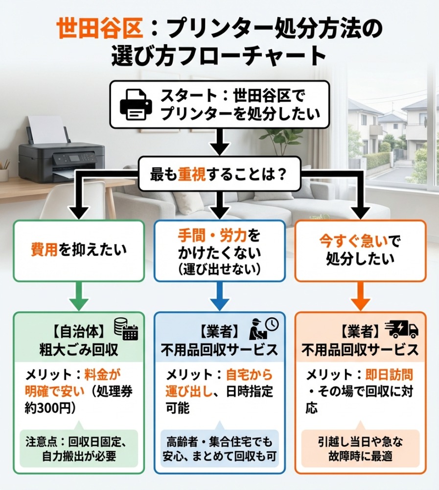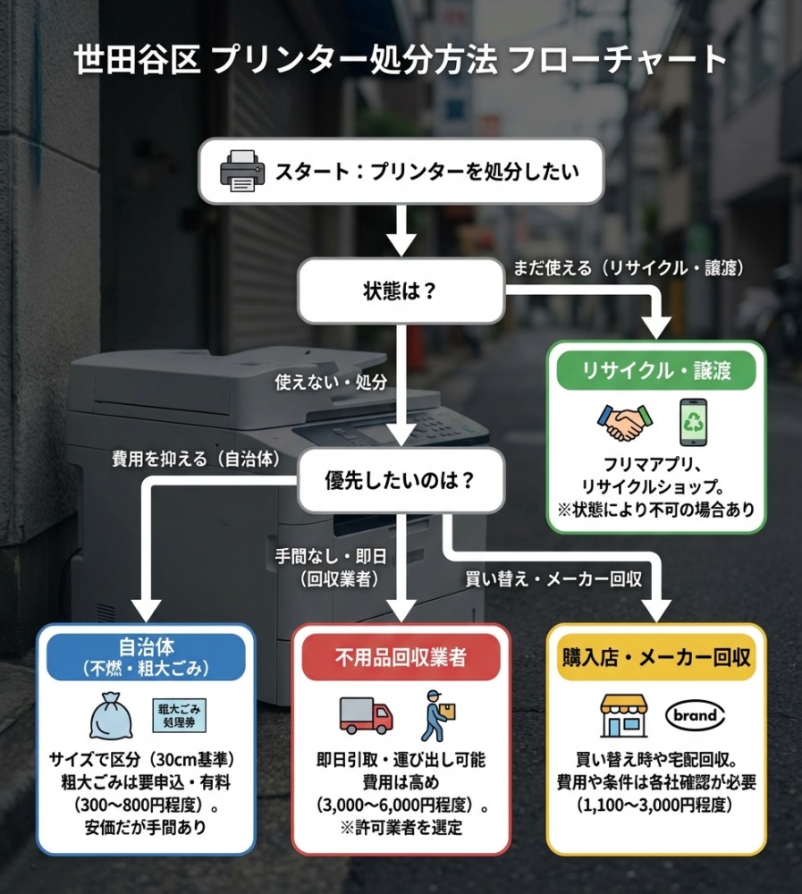 この記事では、世田谷区でプリンターを処分する具体的な方法・かかる費用・回収予約の仕方まで分かりやすく解説していきます。「どの方法が一番安くてラクなのか?」を判断する材料として、ぜひご活用ください。
