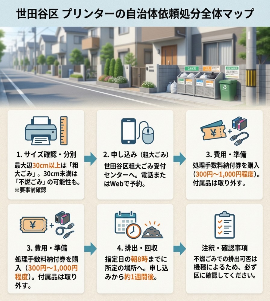 自治体(世田谷区)で粗大ごみとしてプリンターを処分する流れは以下の通りです。