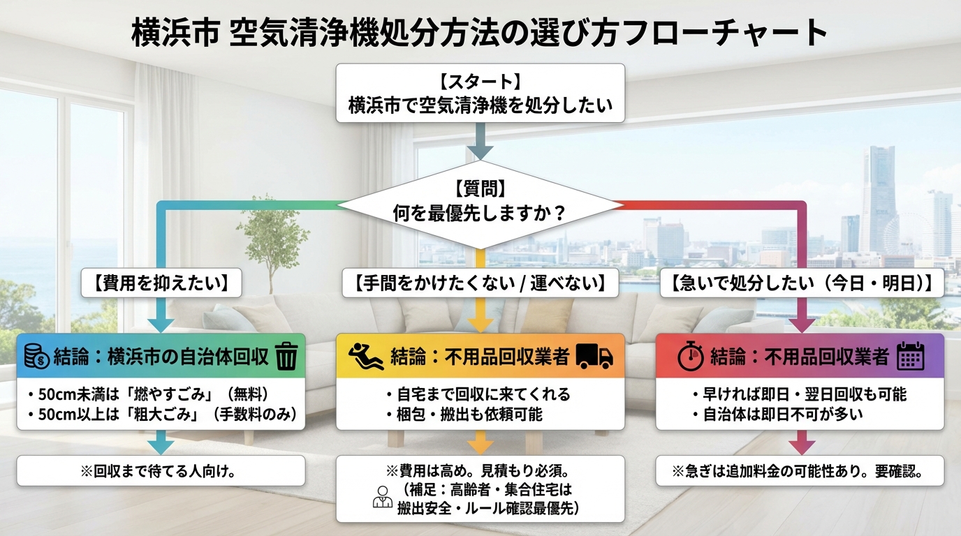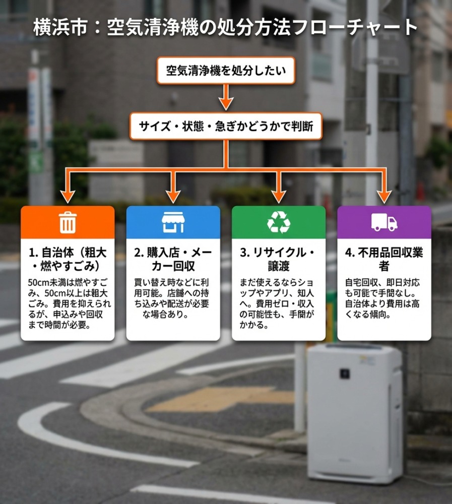 以下では、それぞれの処分方法について、実際に横浜市で可能かどうか、対応場所や申し込み方法、費用について詳しく解説します。