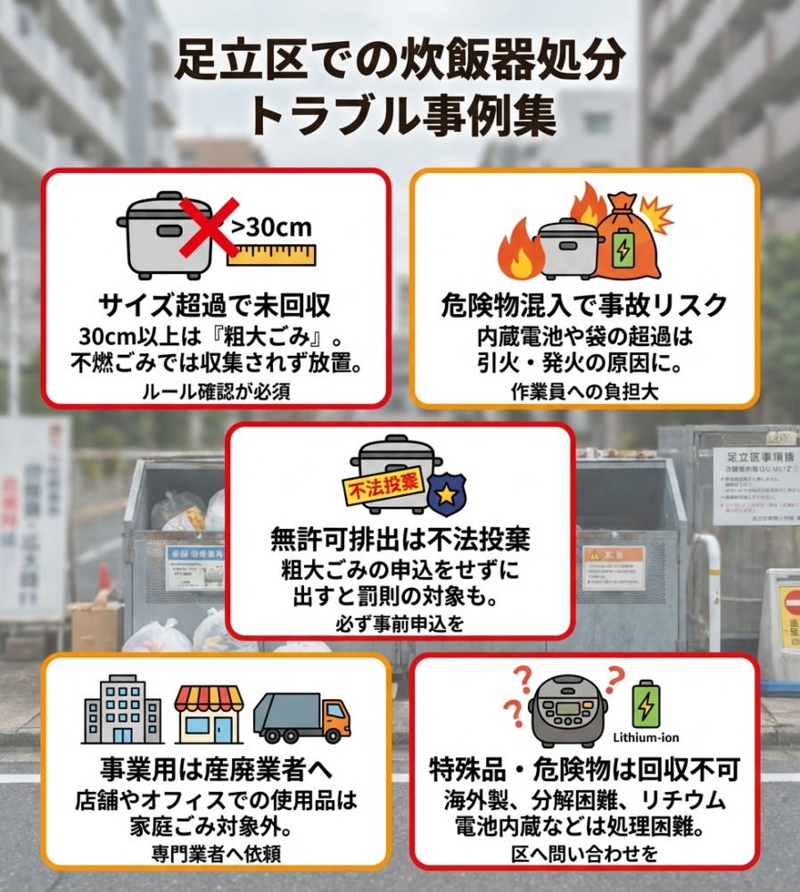 炊飯器を間違った方法で処分してしまうと、さまざまなトラブルの原因となることがあります。ここでは、足立区で実際に起こりやすいケースをご紹介します。