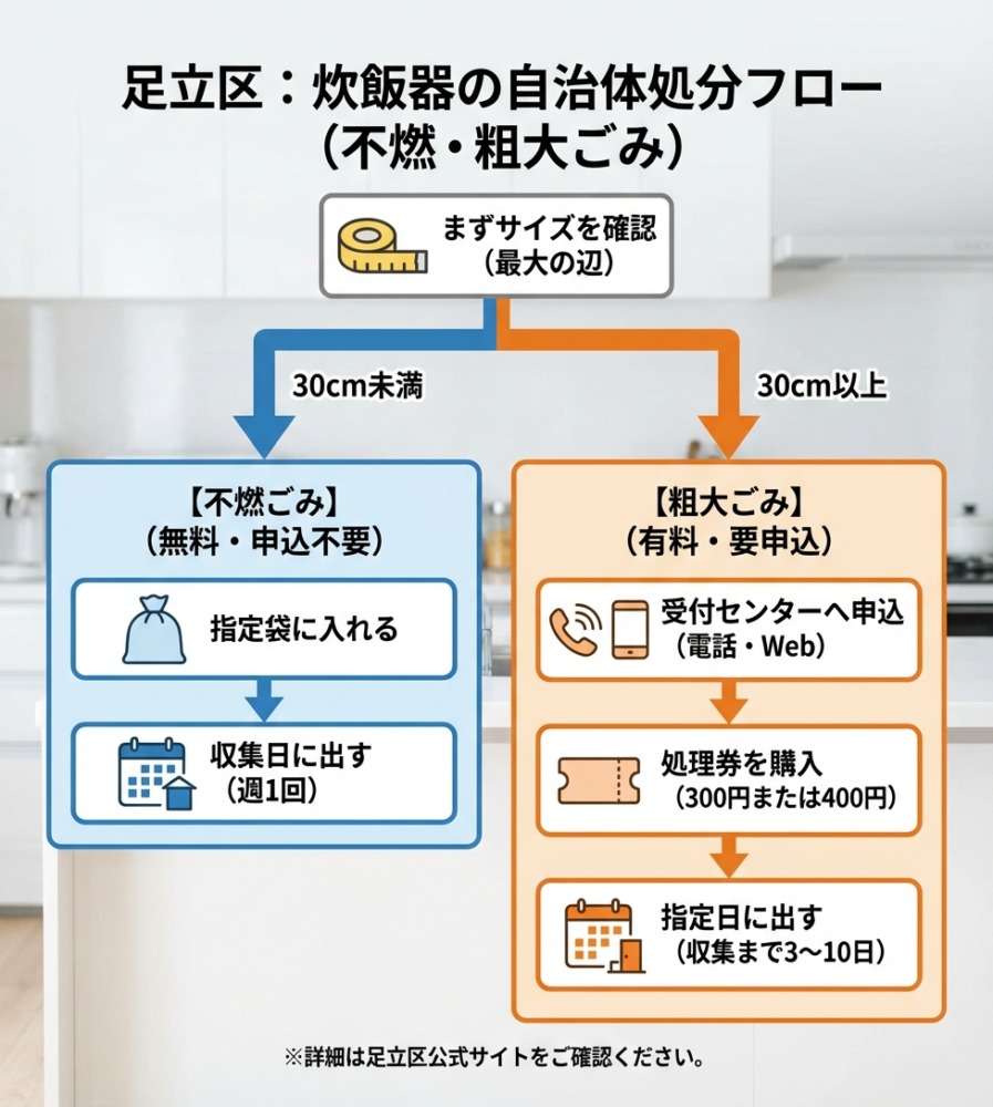 足立区ではサイズによって処分方法が異なります。30cm未満の炊飯器は地域の回収ボックスへ、30cm以上は粗大ごみ(処理券400円)として申し込みが必要です。インターネットまたは電話で自治体に予約をして、処理券を貼って指定日に出します。大型でも不燃ごみとして扱える場合もありますが、状況によります。