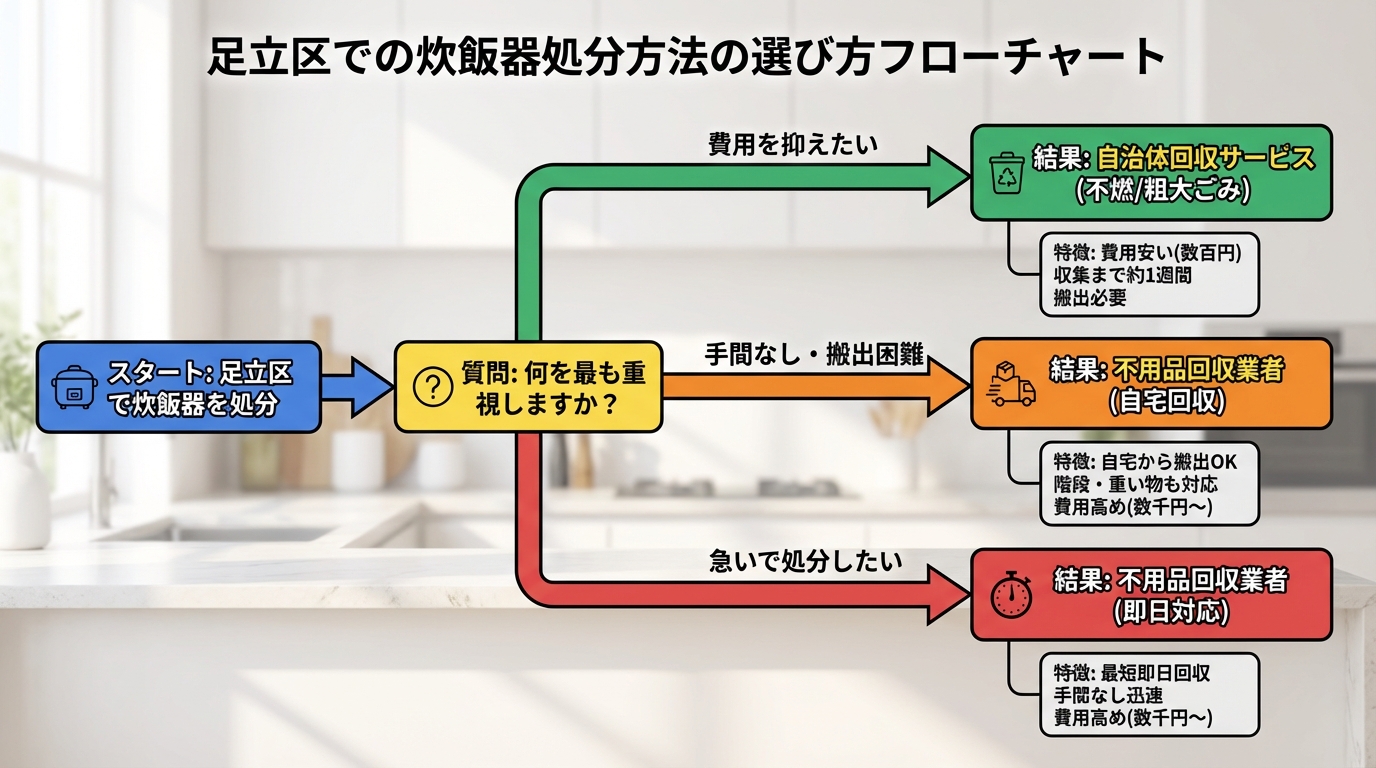 足立区で炊飯器を処分する際は、自分の状況に合った方法を選ぶことがポイントです。