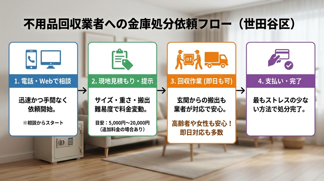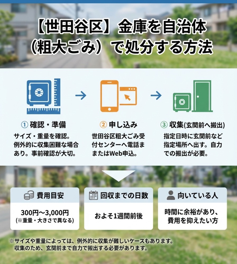 費用を抑えたいなら「自治体の粗大ごみ回収」がおすすめです。世田谷区では金庫も粗大ごみに該当し、処分費用は300円〜1,200円程度と非常にリーズナブルですが、申し込みから収集まで2週間程度かかることもあります。