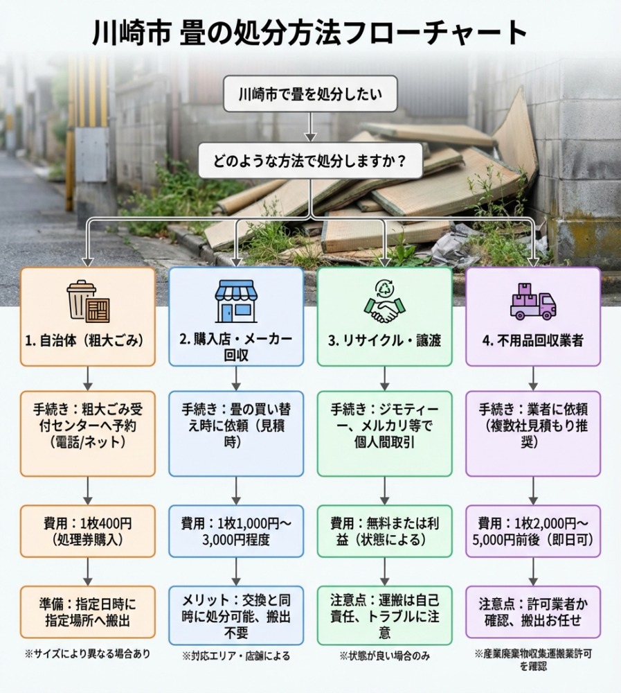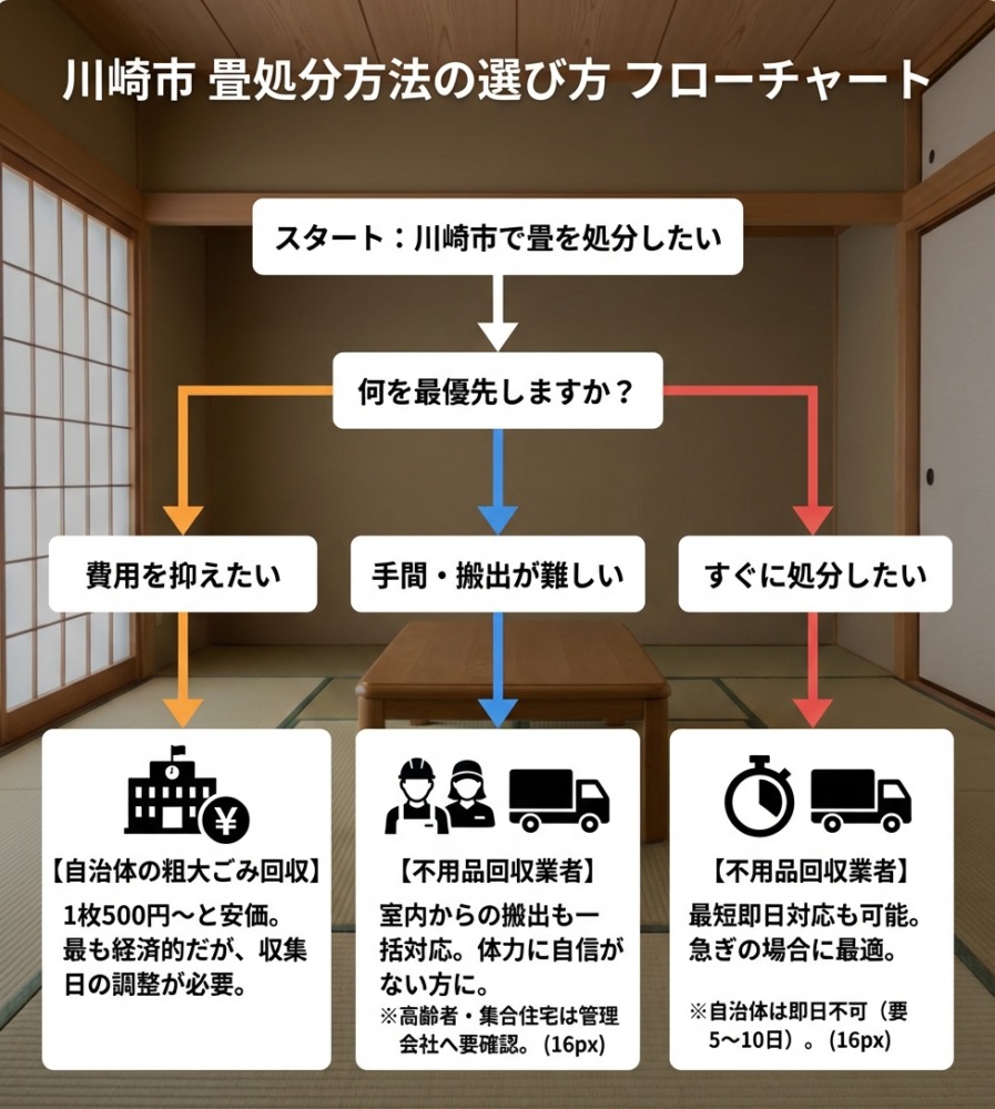 川崎市で畳を処分するにはいくつかの選択肢がありますが、それぞれに手続きや費用、手間の違いがあります。ここでは、実際に処分する際に役立つ具体的な方法や流れをわかりやすく紹介します。