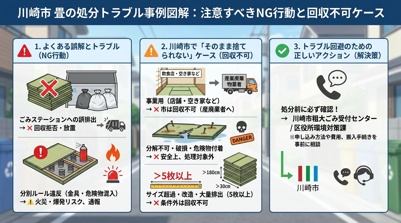 川崎市のごみ分別ルールに違反すると、回収拒否や通報の原因になる場合があります。たとえば、畳の中に金具や釘が含まれていたり、素材に防虫剤などが使用されていたりすると、火災や爆発の危険が生じ、非常に危険です。また、粗大ごみの収集日以外に放置されると、近隣住民とのトラブルや景観悪化にもつながりかねません。