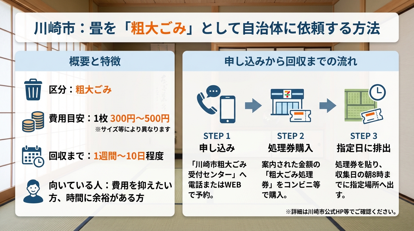 まずポイントは、川崎市では畳を「粗大ごみ」として出すことができ、1枚ごとに処理券(500円~)を購入する方式となっています。