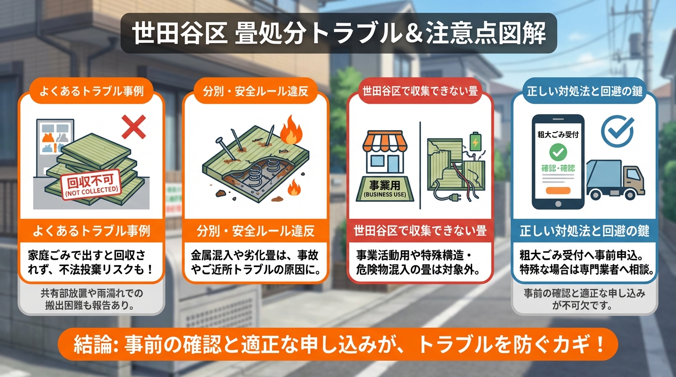 世田谷区で畳を正しく処分しなければ、思わぬトラブルを招くことがあります。まず注意すべきは、畳を家庭ごみや資源ごみと同じようにごみステーションに出しても回収されないという点です。