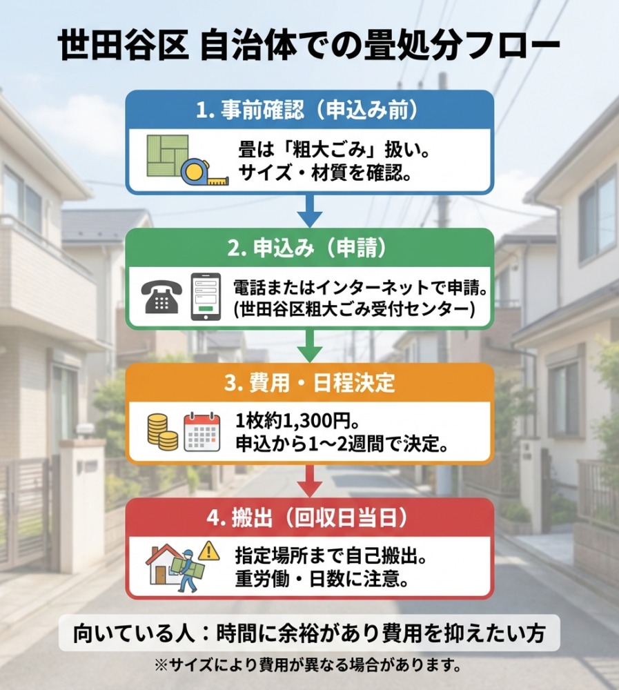 畳は一般的に家庭ごみとは異なり、サイズや材質の関係から粗大ごみの扱いになります。世田谷区では畳を処分する際には、事前に自治体へ申込みを行う必要があります。以下に、処分時の各ポイントを整理したテーブルを掲載します。