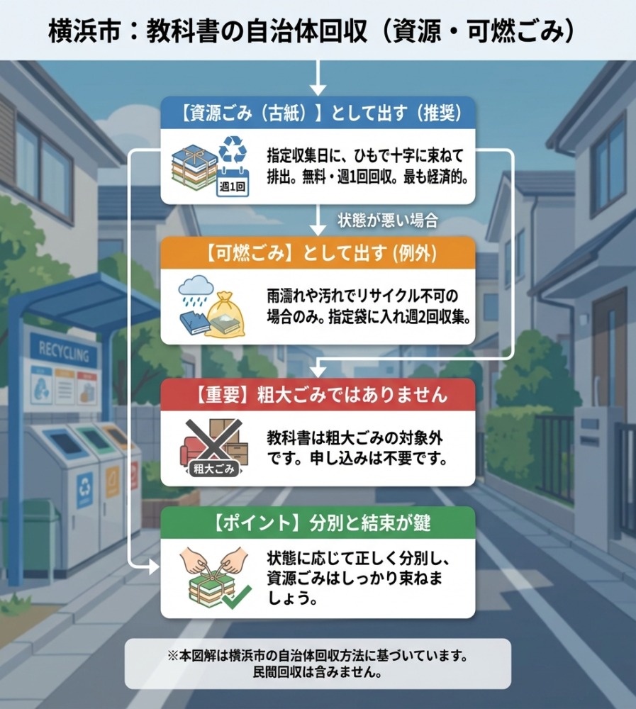 多くの方が迷うのが、「教科書は可燃ごみか?それとも資源ごみか?」という点。横浜市では、教科書は以下のように分類されます。