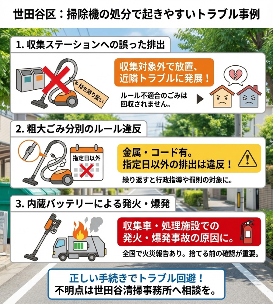 掃除機を何気なくごみステーションに出したところ、「持ち帰り扱い」になってしまったというトラブルは世田谷区でも多く発生しています。ルールに適さないごみは収集対象外とされ、収集日が過ぎてもその場に放置されるため、近隣住民とのトラブルにも発展しかねません。