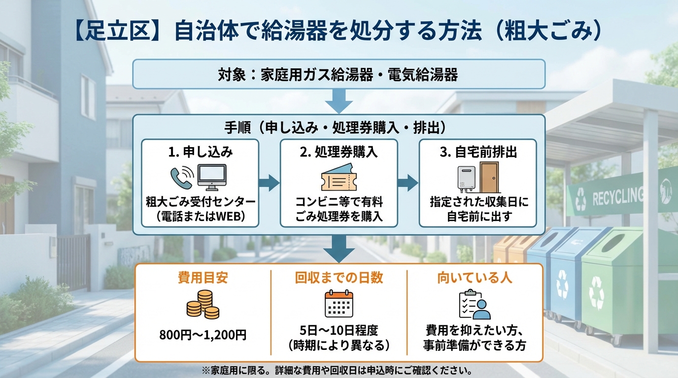 足立区では、家庭用のガス給湯器や電気給湯器であれば、粗大ごみとして申し込み・処理券購入・自宅前への排出という手順で処分可能です。
