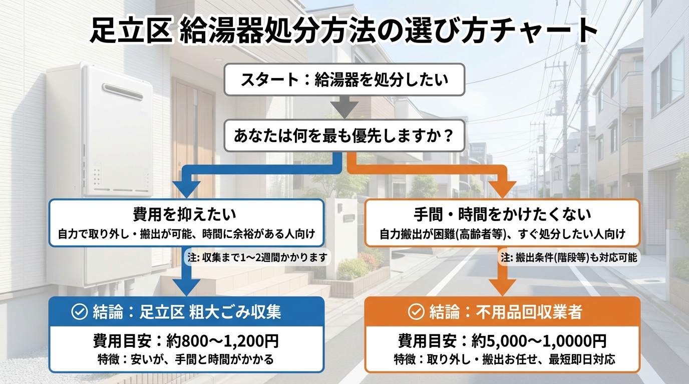 足立区で不要になった給湯器を処分する方法にはいくつか選択肢があります。「安く処分したい」人にも、「今すぐ処分したい」人にも、それぞれ合った手段が選べる環境が整っています。