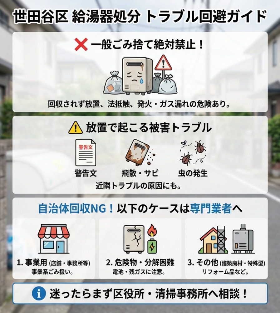 給湯器を不用になったまま一般のごみステーションに出すことは絶対に避けるべきです。世田谷区では通常のごみでは回収対象外とされ、回収されずに放置されるケースが多発しています。